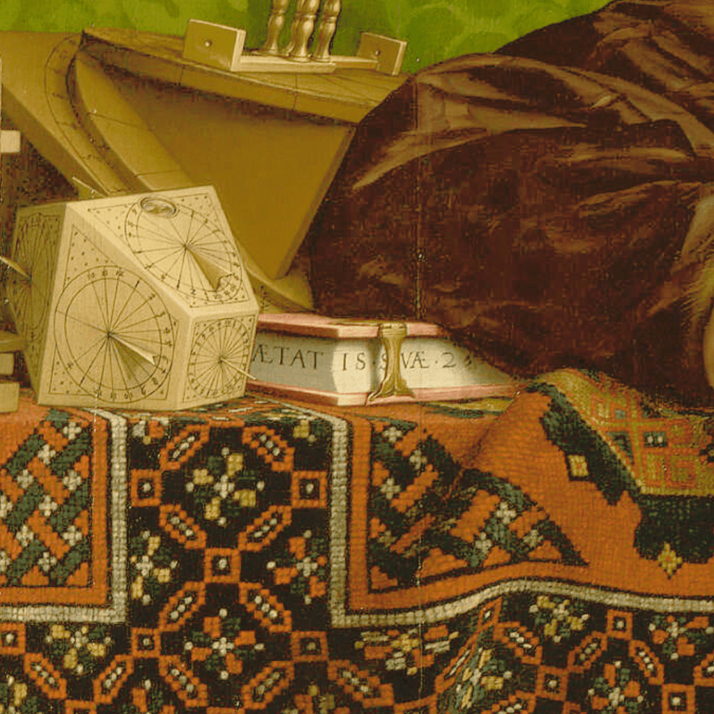 “The Ambassadors” by Hans Holbein is a fascinating place to start our study of Latin found in famous works of art. This beautifully executed work, rich in symbolism, contains the same Latin phrase repeated twice: aetatis suae, followed by the numbers ’25’ and ’29’ respectively.